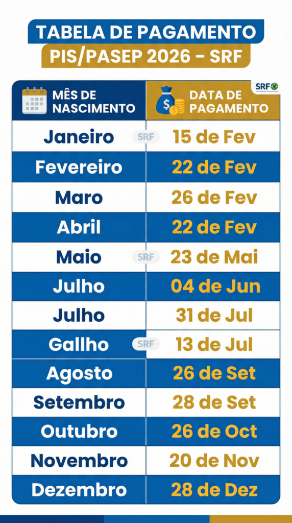 Confira abaixo a tabela completa com as datas de pagamento do PIS/PASEP para 2026, de acordo com o mês de nascimento: